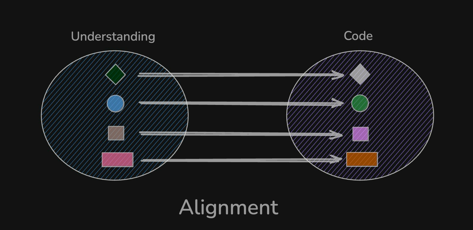 Ultimately, there should be alignment between our understanding and the code. The code may be slightly different as it adheres to the underlying intricacies of the chosen programming language, but the conceptual alignment remains intact.